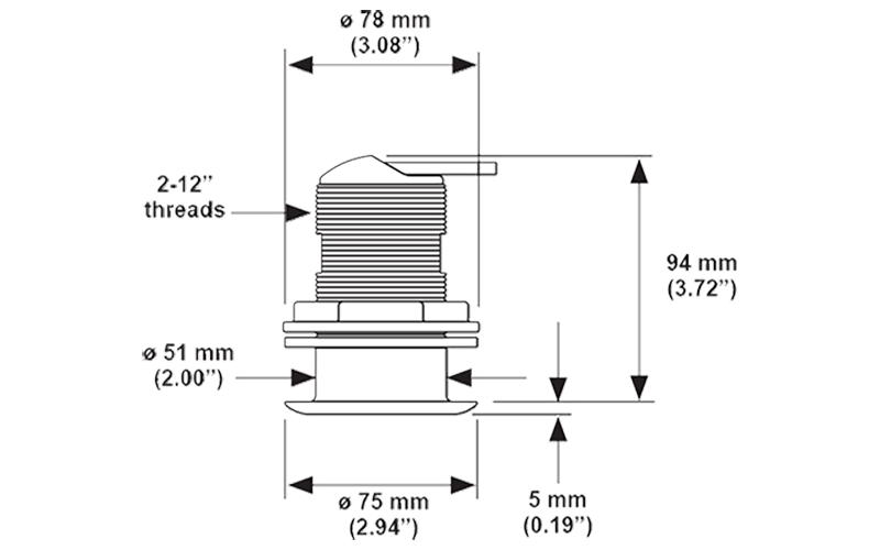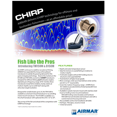 The Airmar B150 is a low-profile, through-hull, single band CHIRP transducer in a bronze housing for Garmin and Lowrance equipment. It is available in the Medium band only
