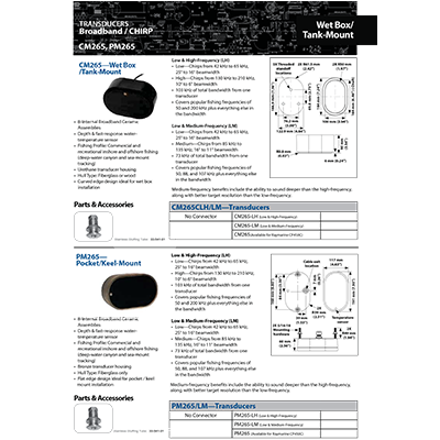 The PM265 is a pocket/keel mount, dual-band CHIRP transducer in a urethane housing. It has 8 internal broadband ceramic elements. The PM265 is available in either the Low & Medium bands or Low & High bands.