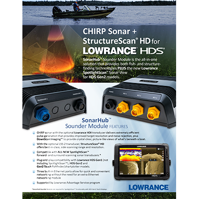 The Lowrance SonarHub is a single-band CHIRP network sounder for HDS-Series displays.
